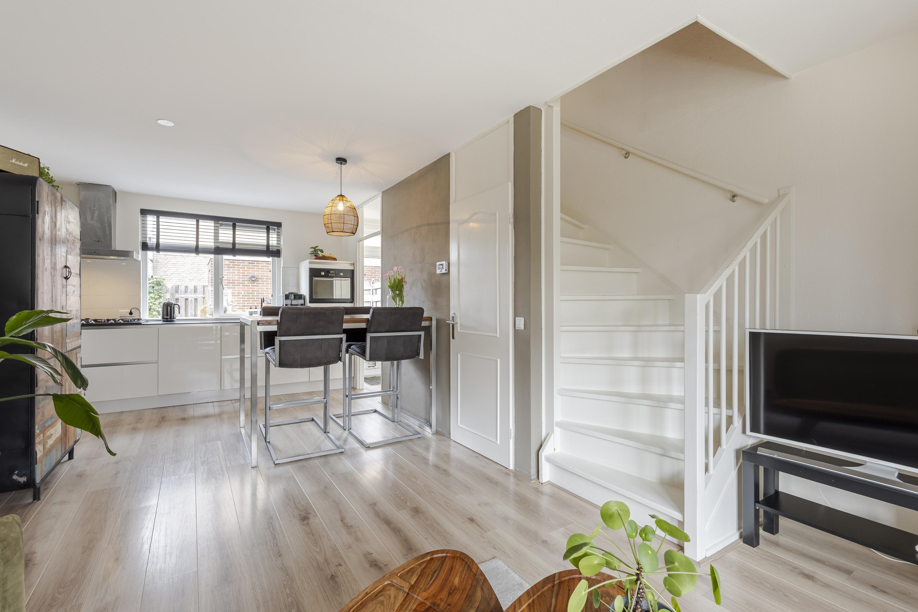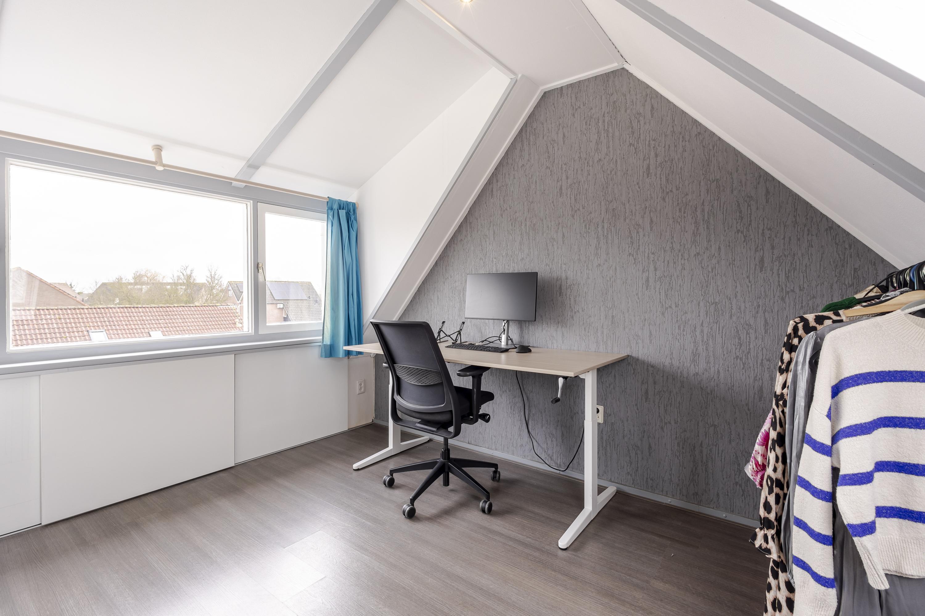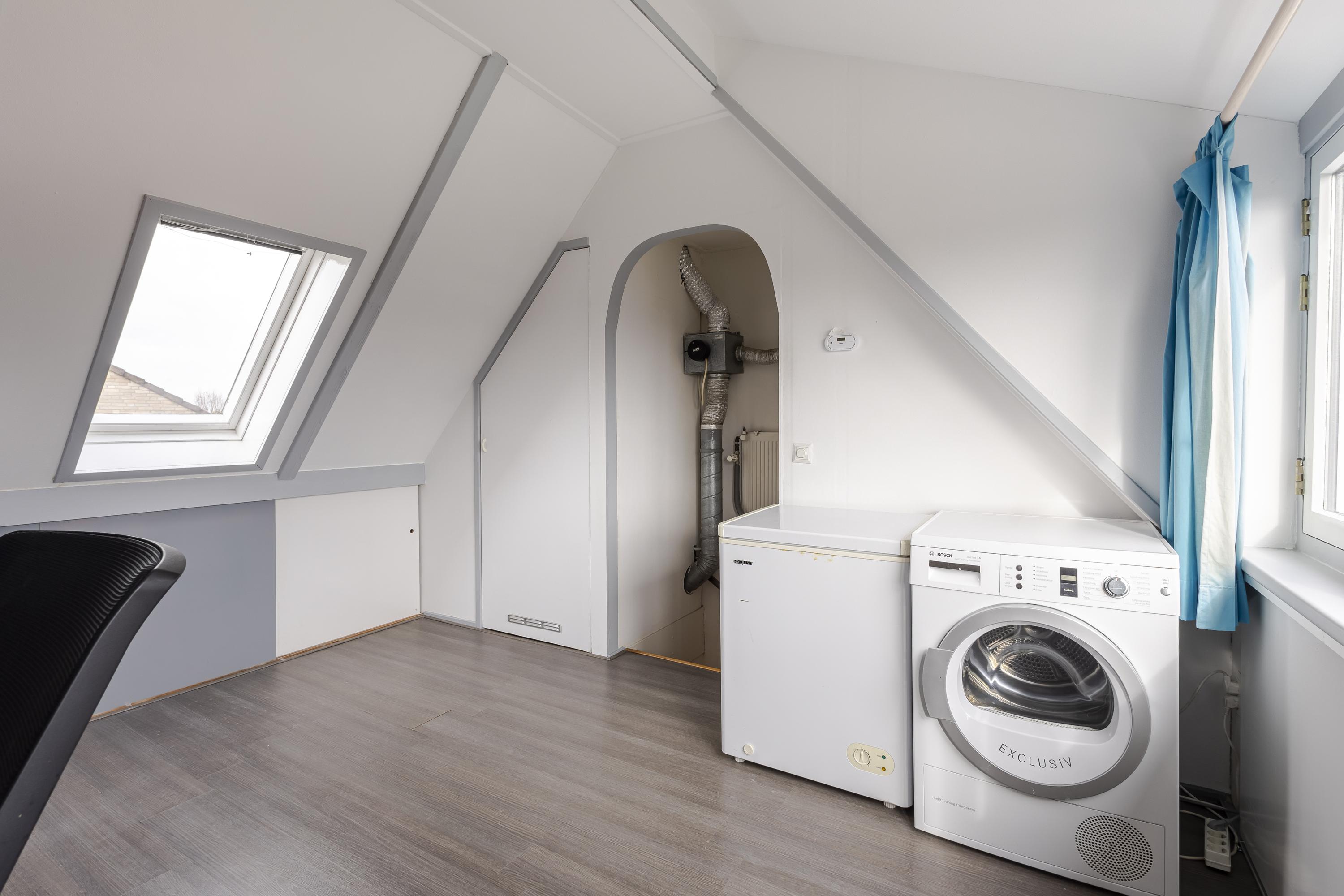 De keuken aan de achterzijde is uitgevoerd in wit hoogglans met hardstenen werkblad en diverse inbouwapparatuur. Op de eerste verdieping zijn twee ruime slaapkamers aanwezig, waarvan de hoofdslaapkamer beschikt over een royale inloopkast. De complete badkamer is volledig betegeld en voorzien van douchecabine, wastafel, tweede toilet en designradiator. De tweede verdieping is volwaardig door de ruime nokhoogte en biedt een derde slaapkamer met brede dakkapel aan de voorzijde. Achter de kastdeuren bevindt zich de CV-opstelling en er is ruimte voor de wasmachine/droger.