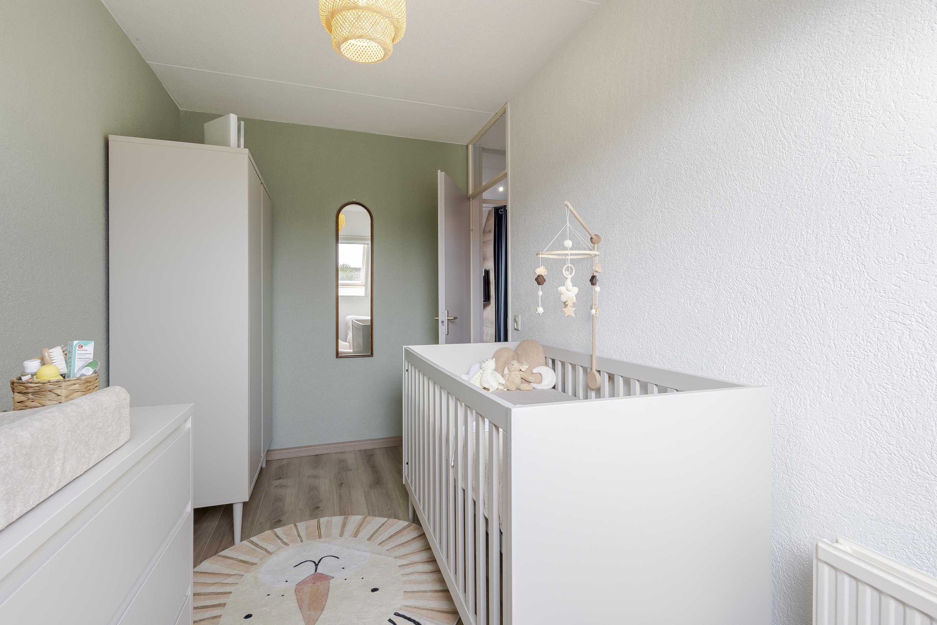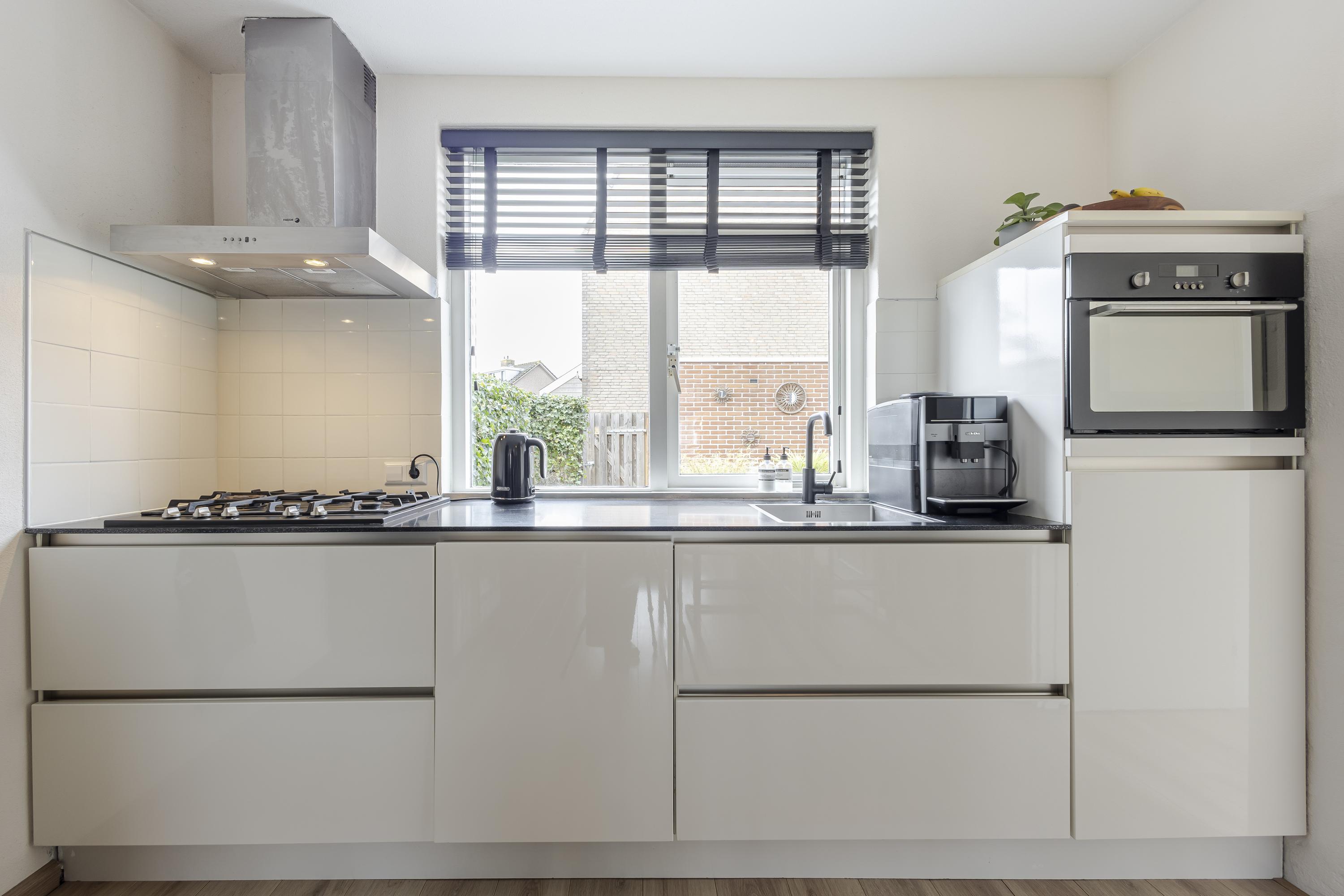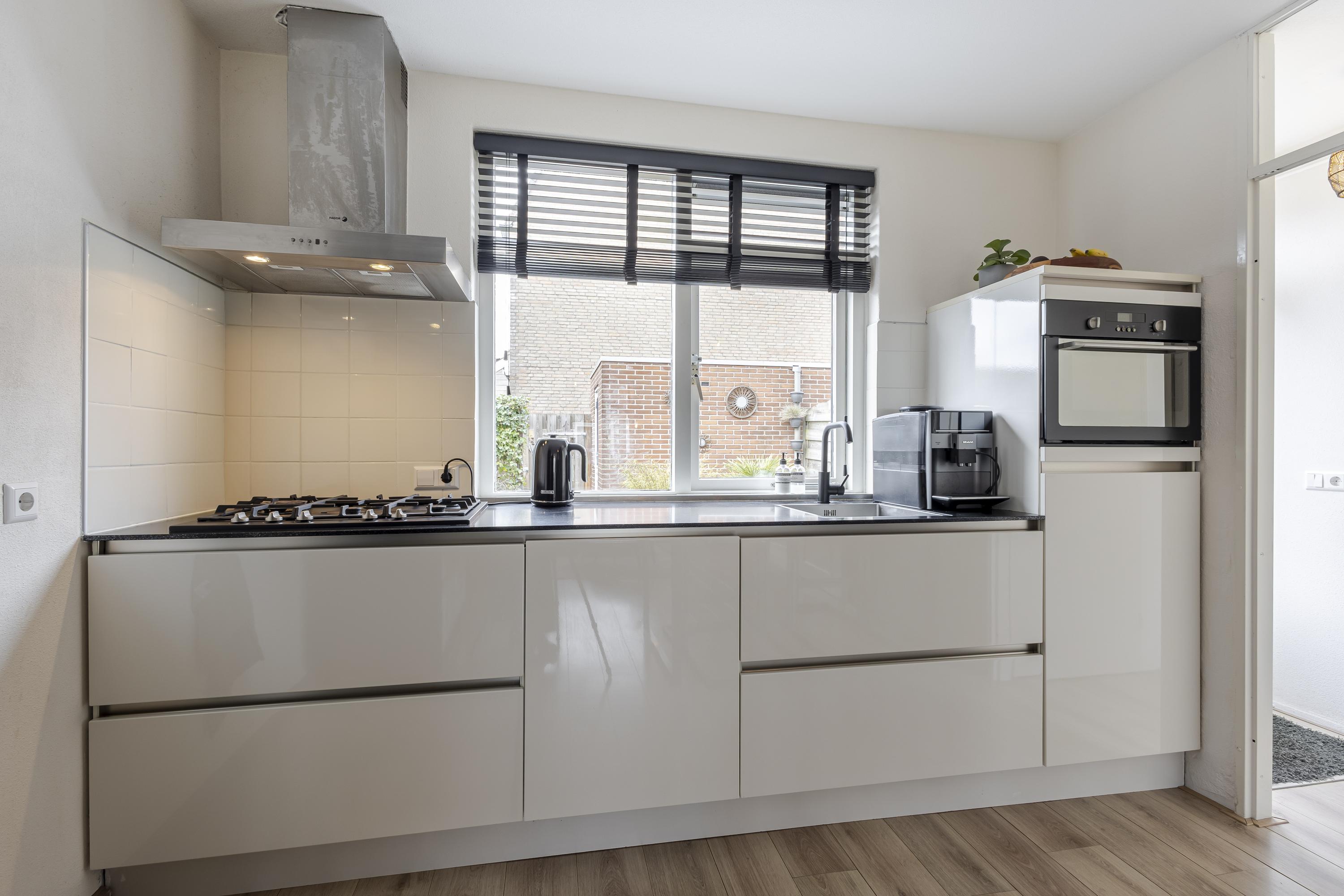 De keuken aan de achterzijde is uitgevoerd in wit hoogglans met hardstenen werkblad en diverse inbouwapparatuur. Op de eerste verdieping zijn twee ruime slaapkamers aanwezig, waarvan de hoofdslaapkamer beschikt over een royale inloopkast. De complete badkamer is volledig betegeld en voorzien van douchecabine, wastafel, tweede toilet en designradiator. De tweede verdieping is volwaardig door de ruime nokhoogte en biedt een derde slaapkamer met brede dakkapel aan de voorzijde. Achter de kastdeuren bevindt zich de CV-opstelling en er is ruimte voor de wasmachine/droger.