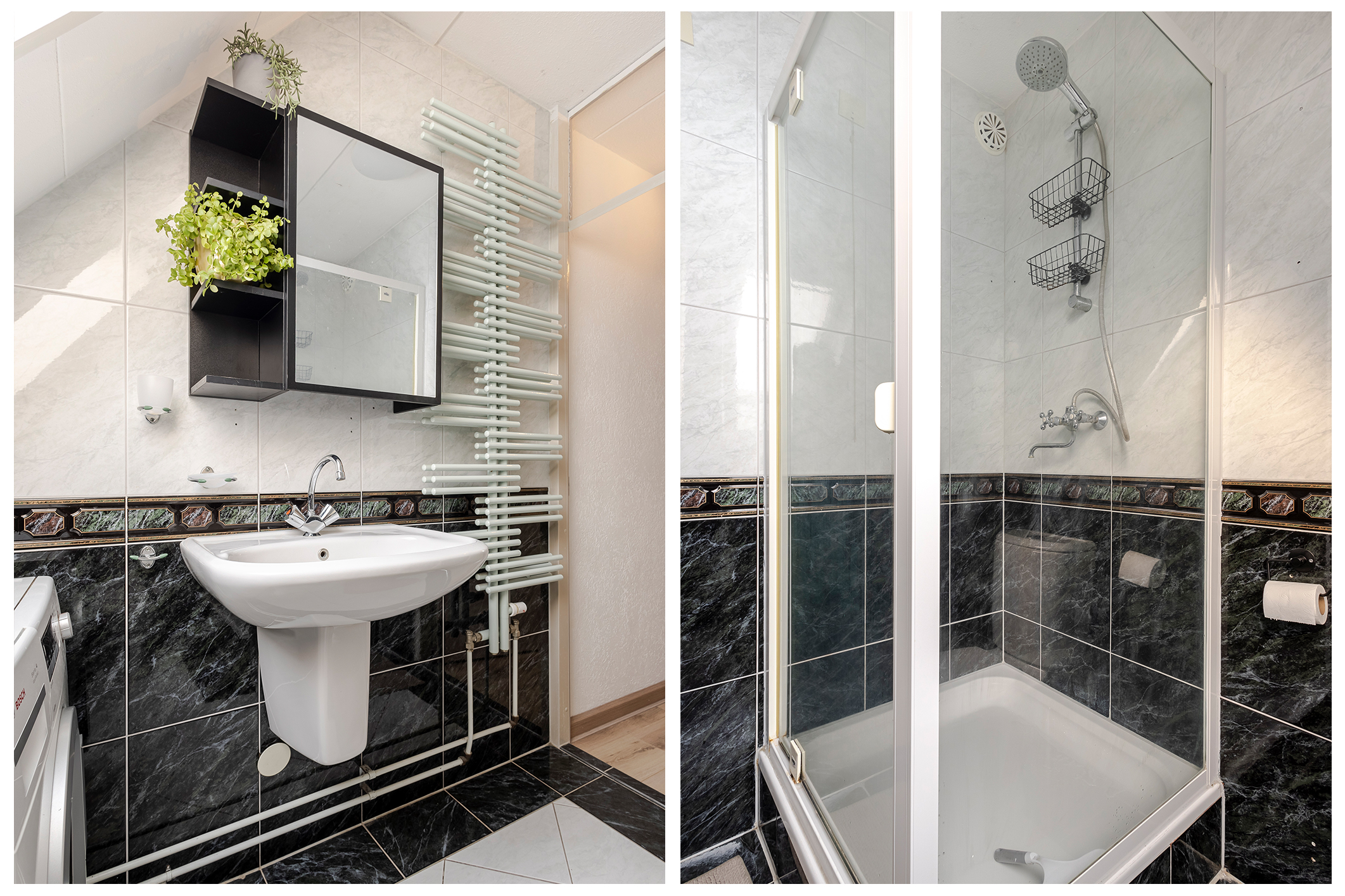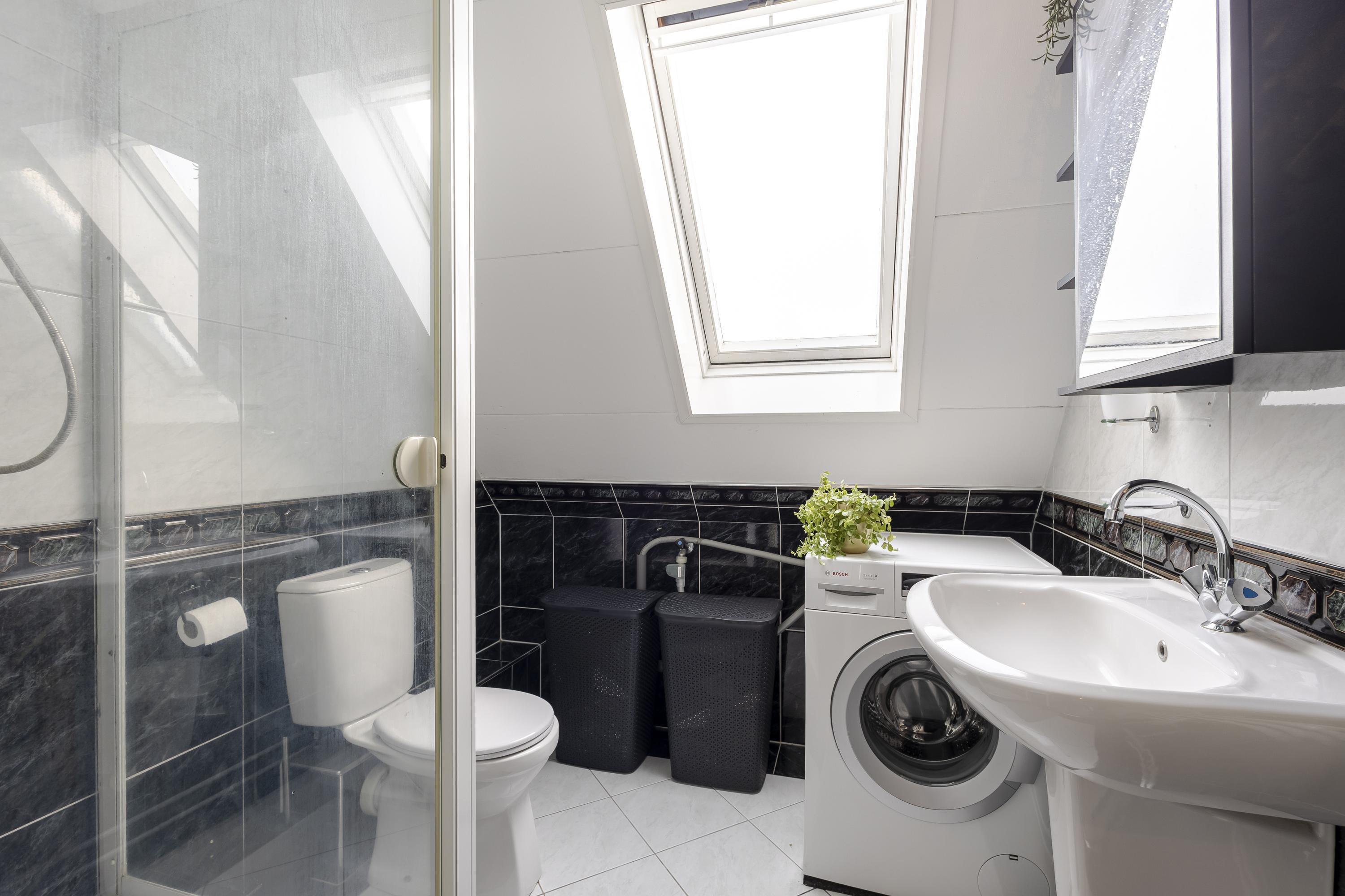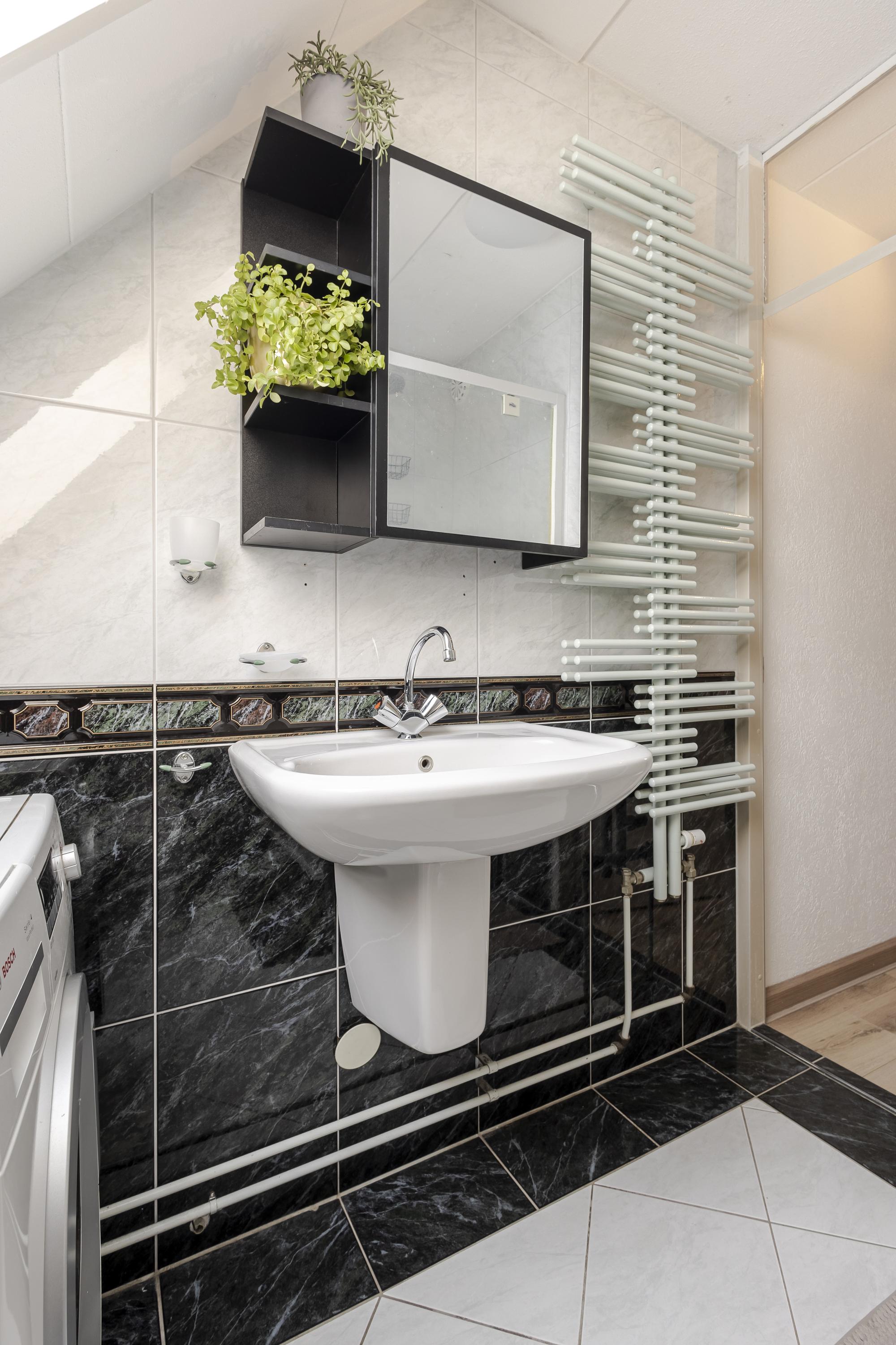 • Modern uitgevoerd in antraciet met wit sanitair