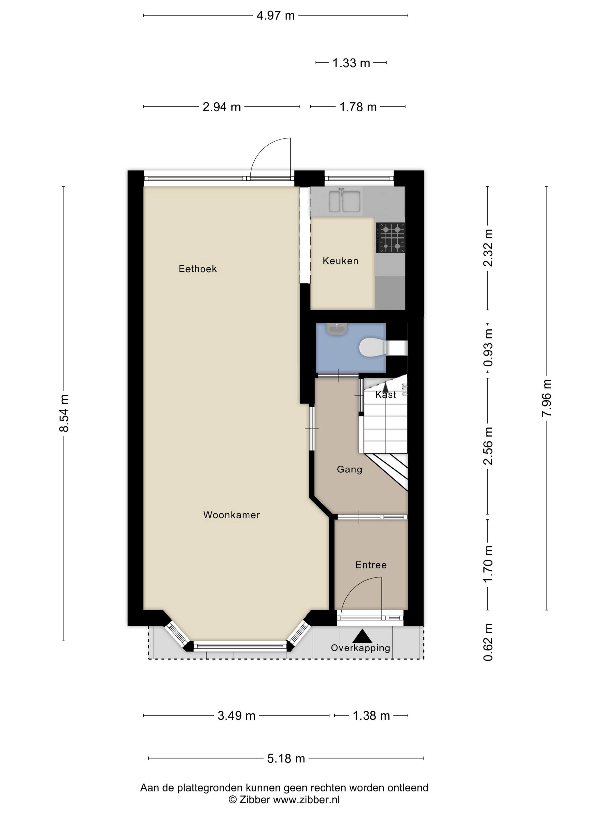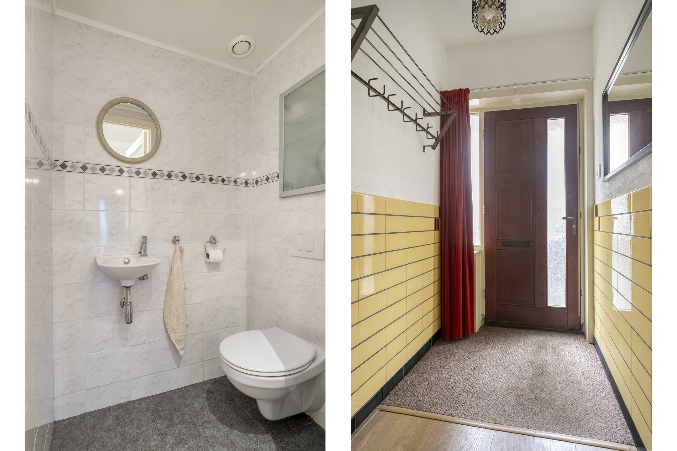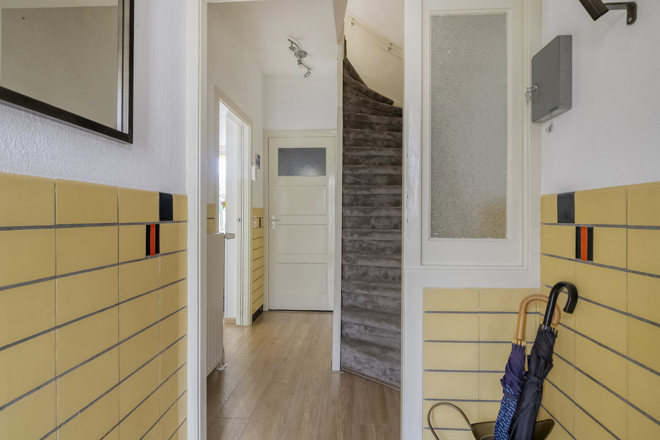 Entree met tochtportaal, hal met trapkast/meterkast, toiletruimte en trapopgang.