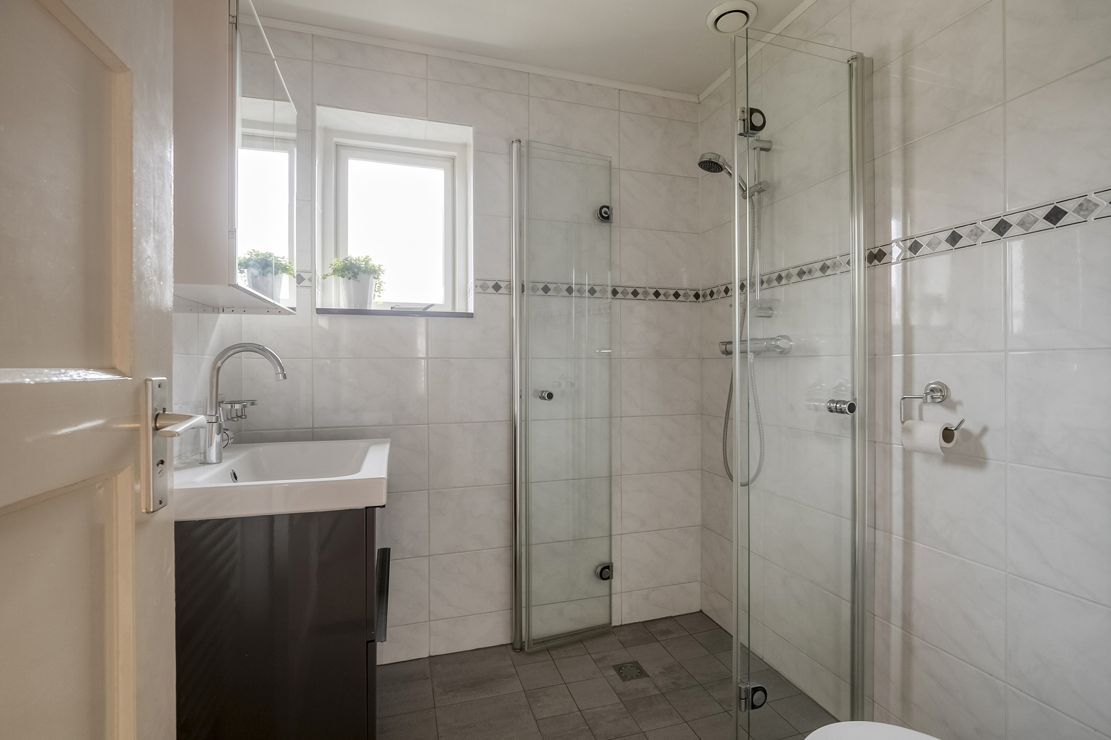 De badkamer (ca. 2015) is modern en voorzien van inloopdouche, wastafelmeubel, wandcloset, radiator en een raam voor prettig daglicht en ventilatie.