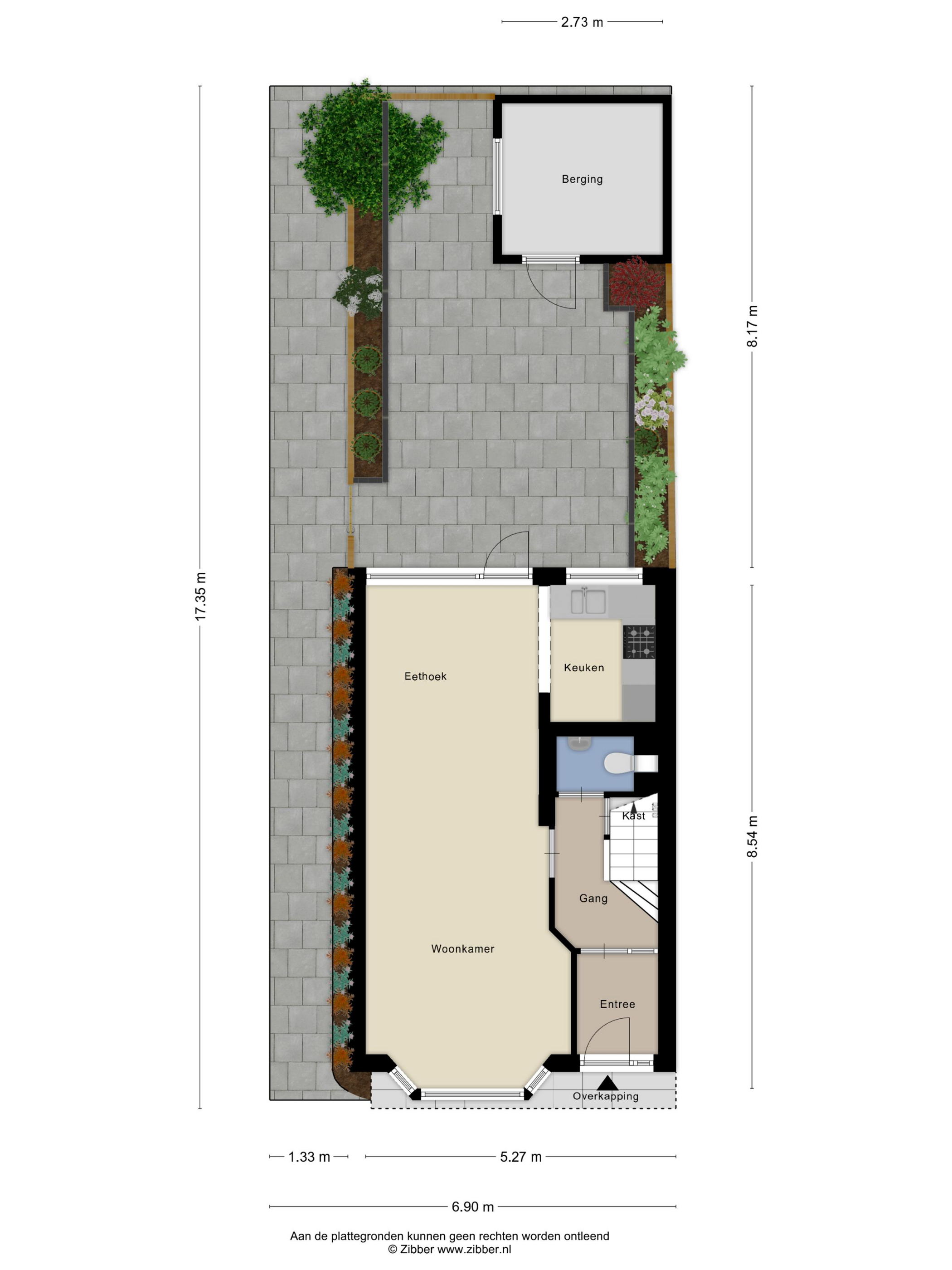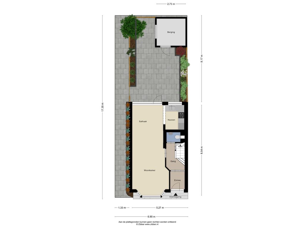 De tuin is georiënteerd op het noordoosten en biedt een fijne plek om te genieten van de middag- en avondzon. Door het ontbreken van directe achterburen is er veel privacy. De ruime stenen berging en de brede achterom zijn praktische aanvullingen.