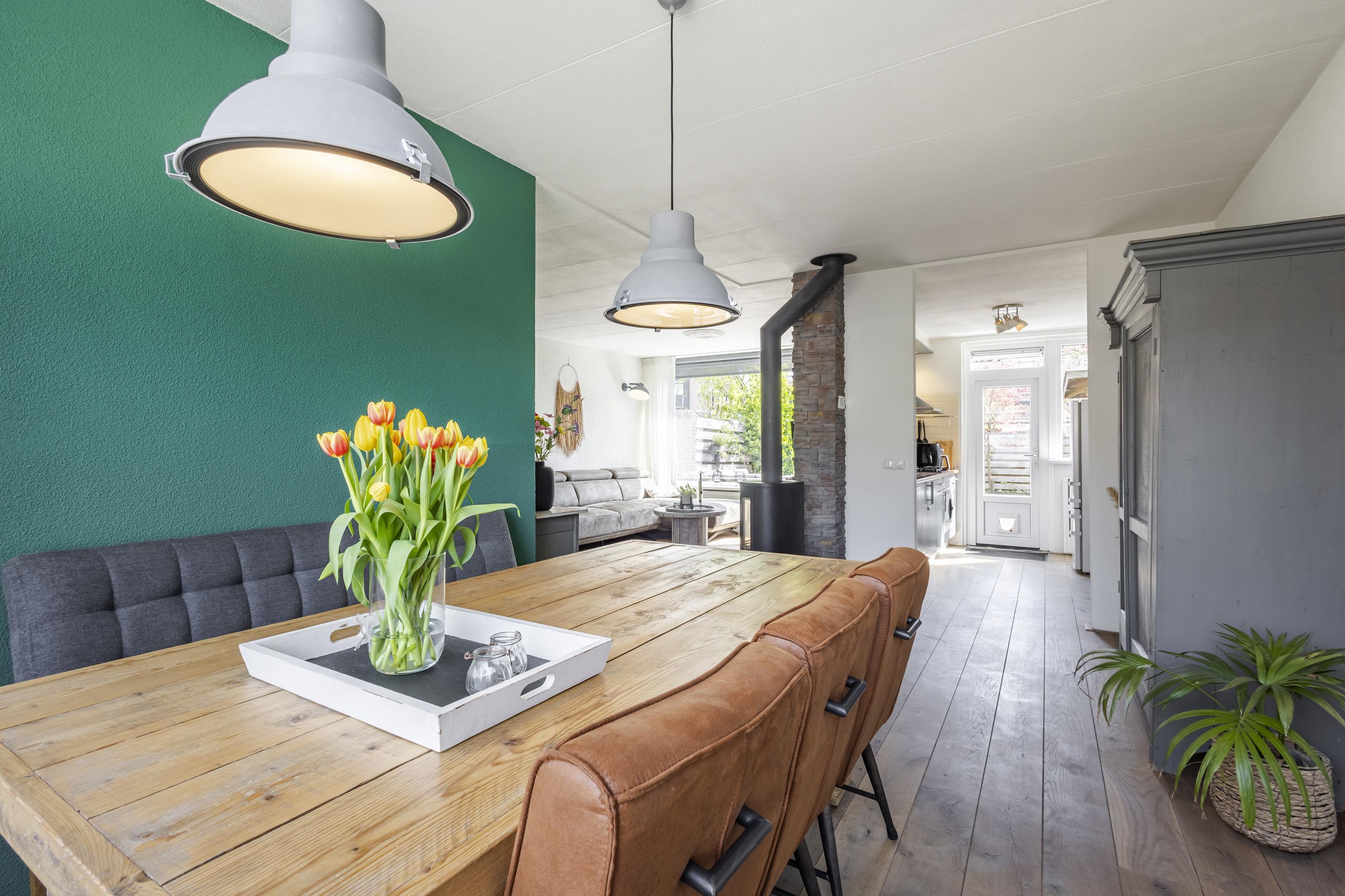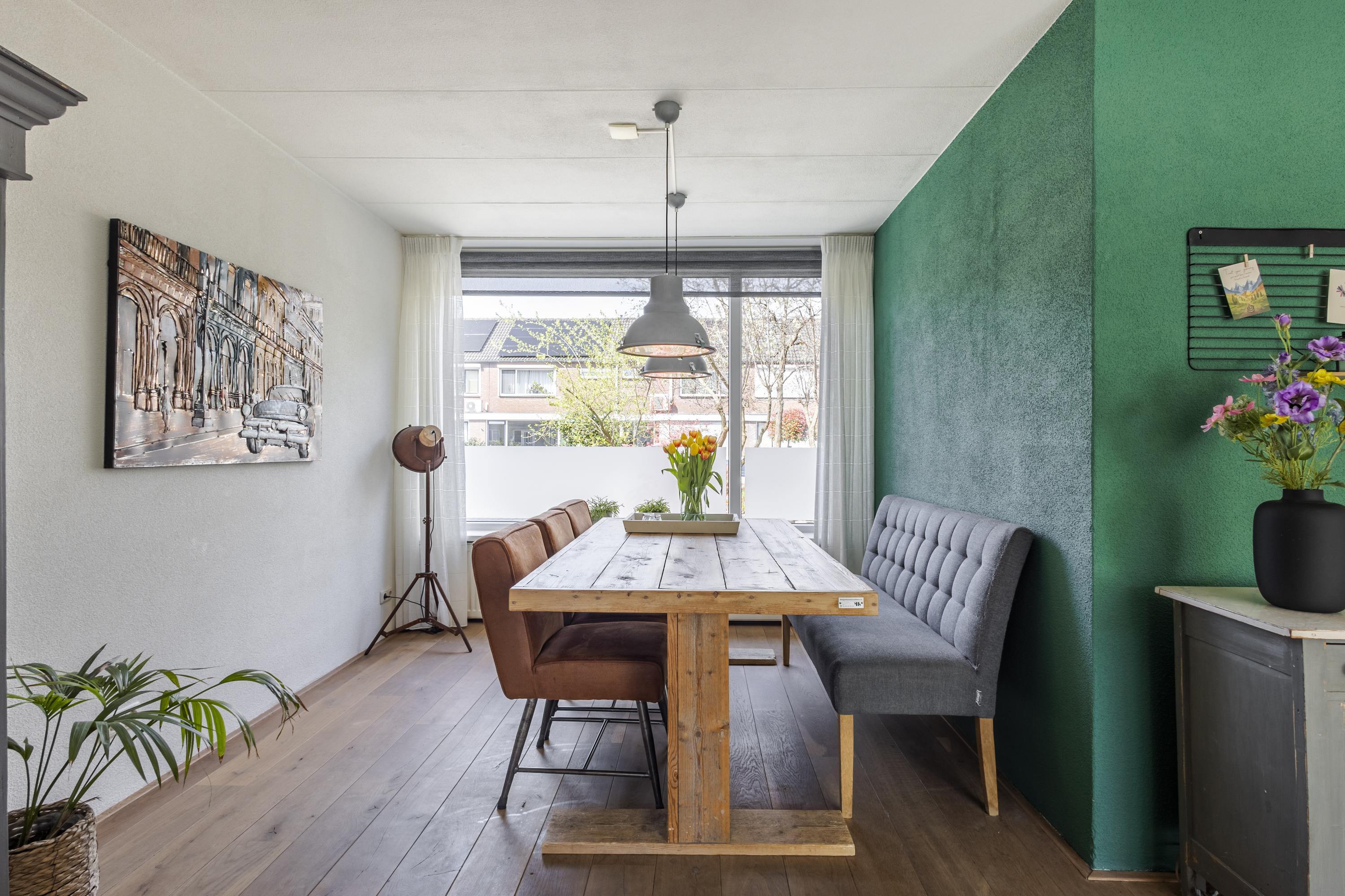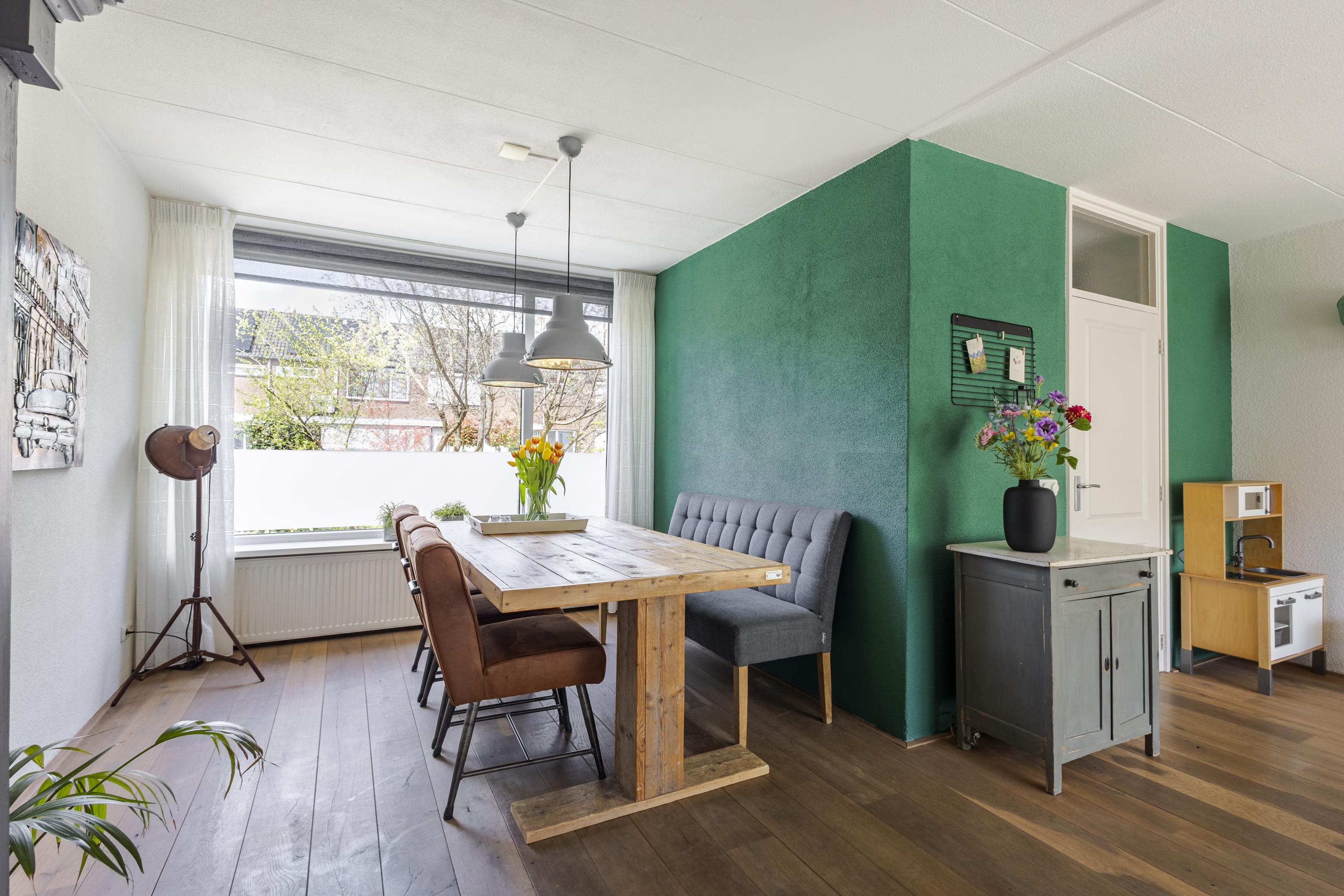 -Royale eethoek aan de voorzijde nabij keuken, met zicht op de voortuin en straat